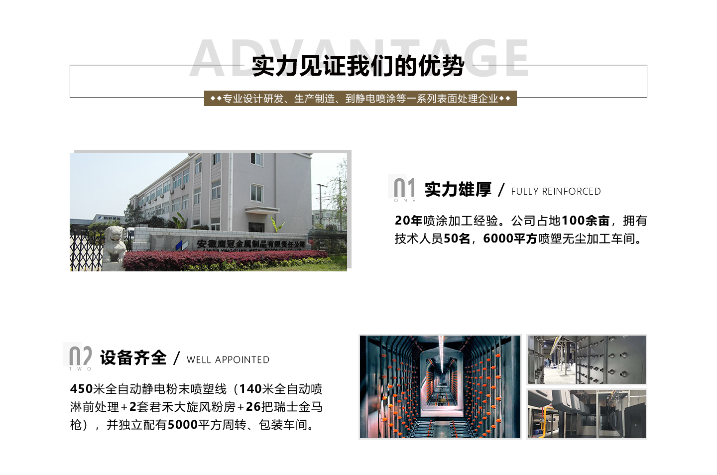 安徽鷹(yīng)冠金屬(shǔ)製品有限責任公司座落於----安徽合肥新城(chéng)開發區,占地100畝(mǔ),總麵積20000平方米,是國內規模較大的彩鋼護欄型材研發(fā)生(shēng)產基地之一。公司於(yú)一九九八(bā)年建廠至今,涉足大型(xíng)零售商業、房(fáng)地產行業近20年,已經形成了從設計(jì)研發、生產製造、到靜電噴塗等一係列表(biǎo)麵處理的專業團隊。公(gōng)司“新冠”彩(cǎi)鋼係列產品基材采用無縫鍍(dù)鋅鋼,雙麵高溫熱鍍鋅處理(lǐ),表麵處理(lǐ)使用阿克蘇諾貝爾公司的富鋅環氧塗層,聚酯(zhǐ)彩色粉末塗層(céng),經二十多道防腐經典噴塗(tú)工藝。產(chǎn)品具有出眾的防鏽蝕、耐鹽霧、耐(nài)油煙、耐(nài)濕熱、耐刮擦的優良特性。現公(gōng)司擁(yōng)有150名員工,其中技(jì)術人員20名,技工30名。2006年建立新冠彩鋼設計研發檢測中心,由多名...